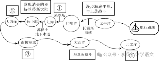 (2)假如小语是一名年轻的革命战士,上级派小语去送一份非常重要的机密文件,小语想邀请《海底两万里》中的尼摩组队前往,结合该人物的经历和性格,简述小语邀请他的理由。 【答案】(1) A.海底 B.搁浅,土著围攻,同鲨鱼搏斗,冰山封路,章鱼袭击等。 (2)示例:因为尼摩船长勇敢坚毅,镇定沉着,富有正义感,有着超人的智慧和创造性。他自己设计和制造了“诺第留斯号”潜艇,在海底进行大规模的科学研究,并用海底沉船里的千百万金银来支援陆地上人们的正义战争;他智斗鲨鱼救采珠人,击退土著人的袭击,在冰山封路时成功突围。和这样一位斗争经验丰富的战斗义士组队,即使有突发情况出现,也定能化险为夷,顺利完成任务。 |